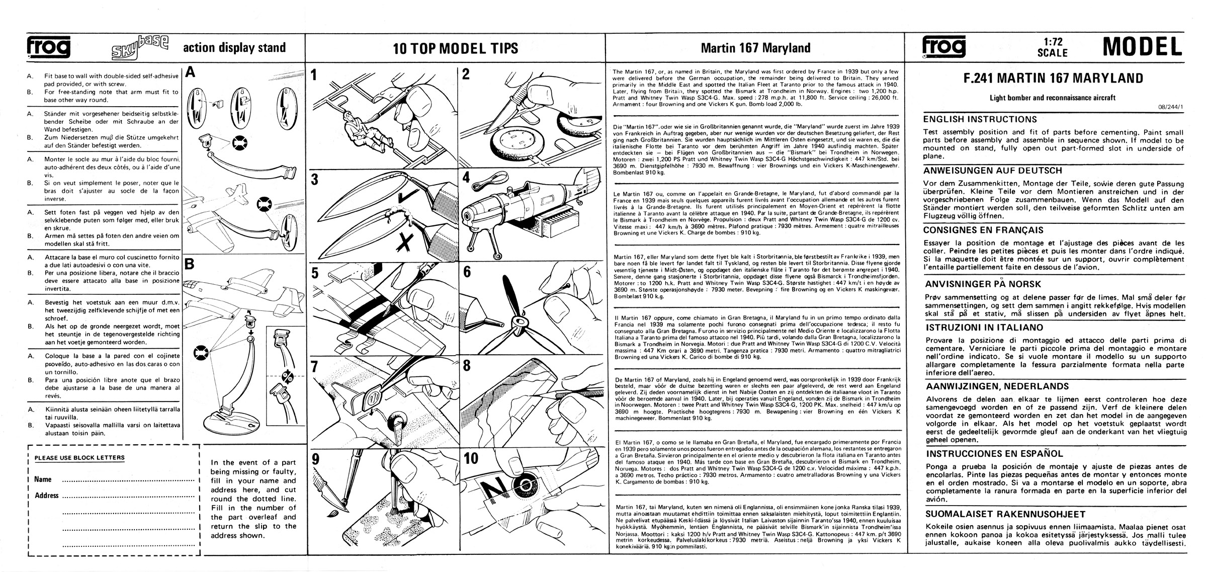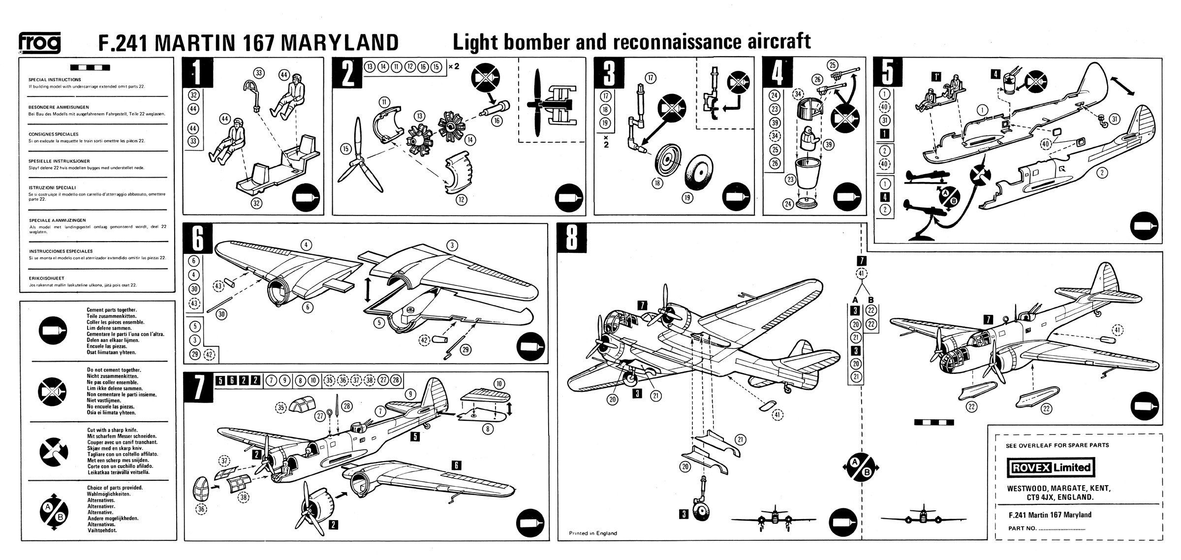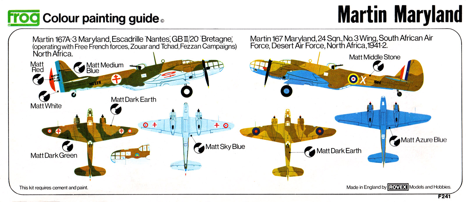 Пресс-форма для модели бомбардировщика под первым коробочным названием “Martin 167 Maryland” в масштабе 1/72 была готова в 1972 году. Несмотря на ряд упрощений, модель действительно оказалась очень удачной и, что было более важно, не имела на тот момент альтернативы. В каталоге FROG она получила индекс F241.