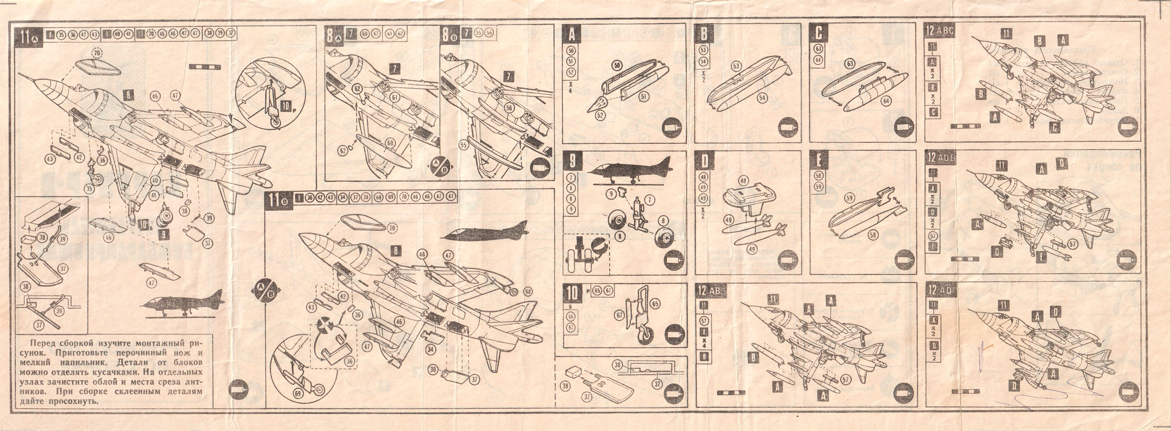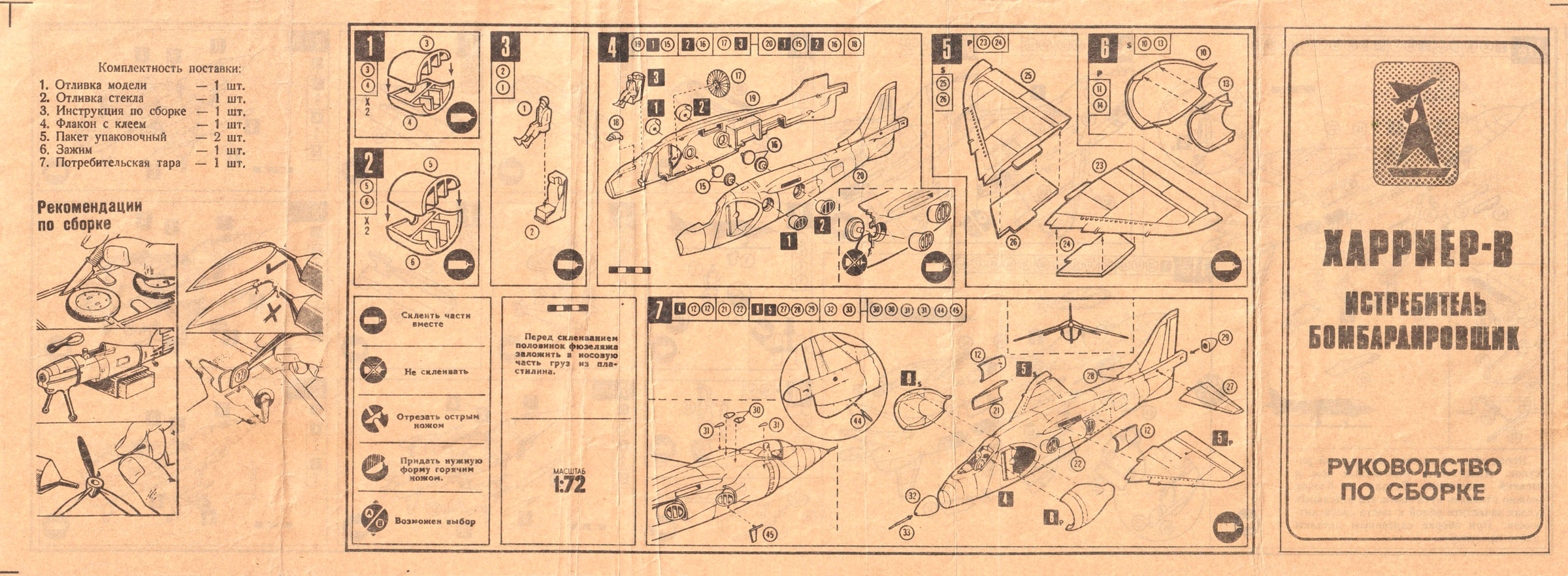 Первые массовые отливки появились в 1979 году. К этому времени британская сторона в лице фирмы Novo Toys Ltd. уже подготовила партию полиграфии и внесла “Harrier” в свой каталог, присвоив ему индекс 78087. На лицевой части коробки был сохранен “экс-фроговский” бокс-арт с изображением самолёта из состава RAF, равно как были сохранены схемы окраски и декаль. С учетом того, что на “переводных картинках” изменилось только расположение элементов, очень удивительно то, как удалось “протащить” американский вариант через мелкое сито советской цензуры. Коробочное название модели теперь звучало как “Harrier – V\STOL Ground Attack Fighter”.