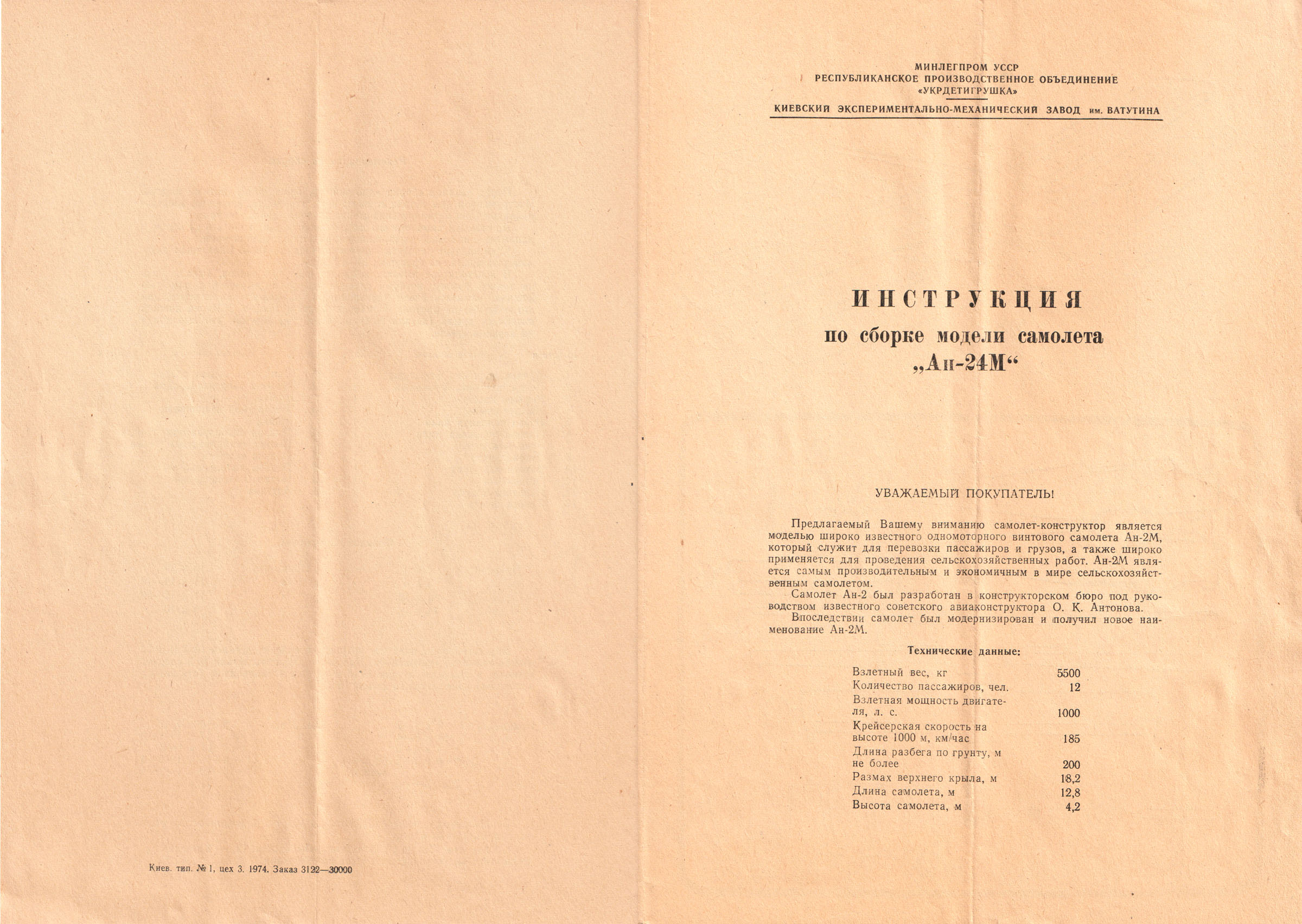 История сборной модели “Ан-2м”, выпускаемой Киевским механическим заводом игрушек им.Ватутина, не так богата на события, как у её аналога от фирмы Plasticart из ГДР. Более того, на сегодняшний день точно не известно, была ли это самостоятельная разработка КБ КМЗИ, или за основу была взята модель из “макетки” ОКБ Антонова (часть моделистов, работавших с этой моделью, сходятся на втором варианте). Примерный масштаб модели оценивался как 1:50.