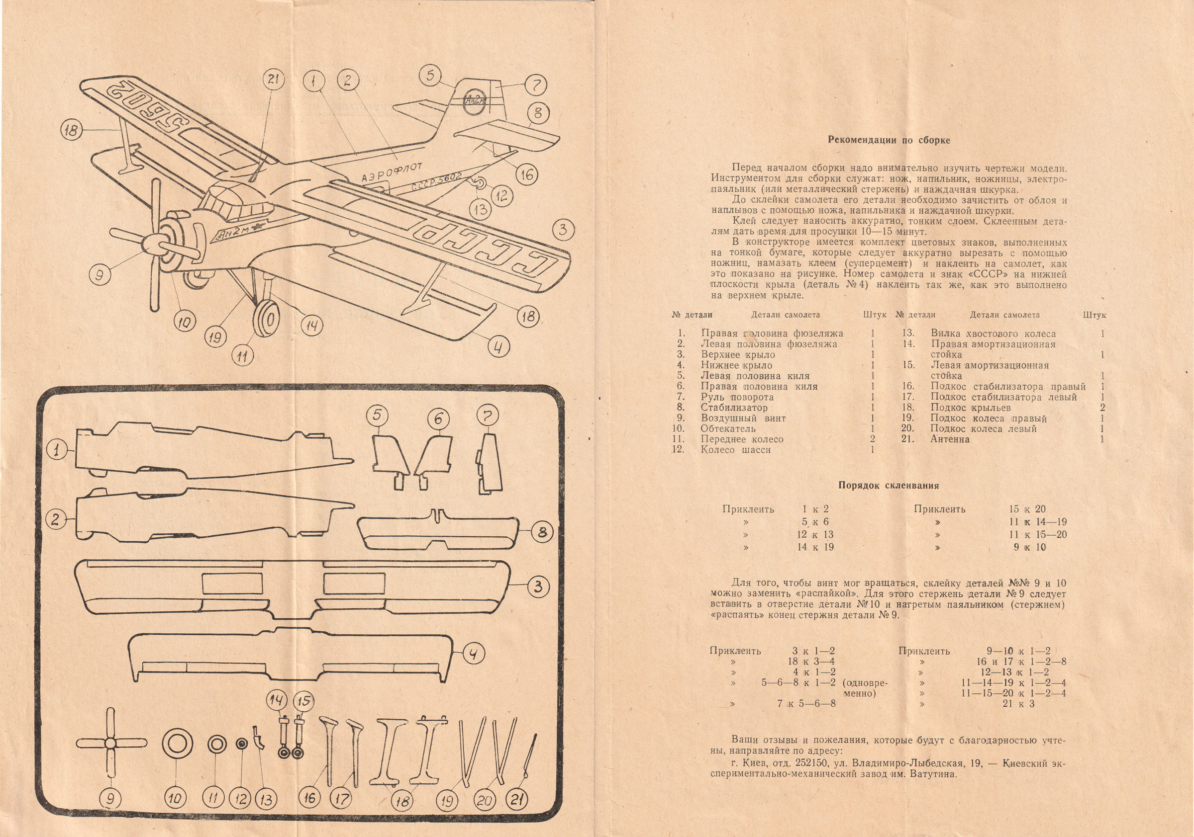Немного положительных эмоций добавляло оформление. Отливки упаковывались в коробку из плотного картона с “детским” рисунком самолёт на её верхней части. В набор входила инструкция на листе формата А3, с чуть более понятной схемой сборки, чем у модели “И-16 тип 24”, выпускаемой тем же предприятием. Декаль, как таковая отсутствовала – вместо неё КМЗИ комплектовал модель “Ан-2м” листом с обычной полиграфической печатью ливреи и номеров Аэрофлота.