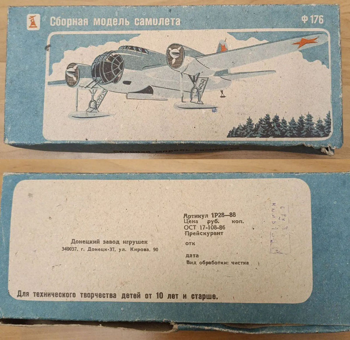 На внутренний рынок СССР модель попала в “фирменной” донецкой коробке с максимально упрощенным “нововским” рисунком, где взрыв на заднем плане был заменен на несколько елей. В то же время, хотя название на коробке звучало как “Сборная модель самолёта Ф176″, хотя в инструкции было указано “Туполев СБ-2”.