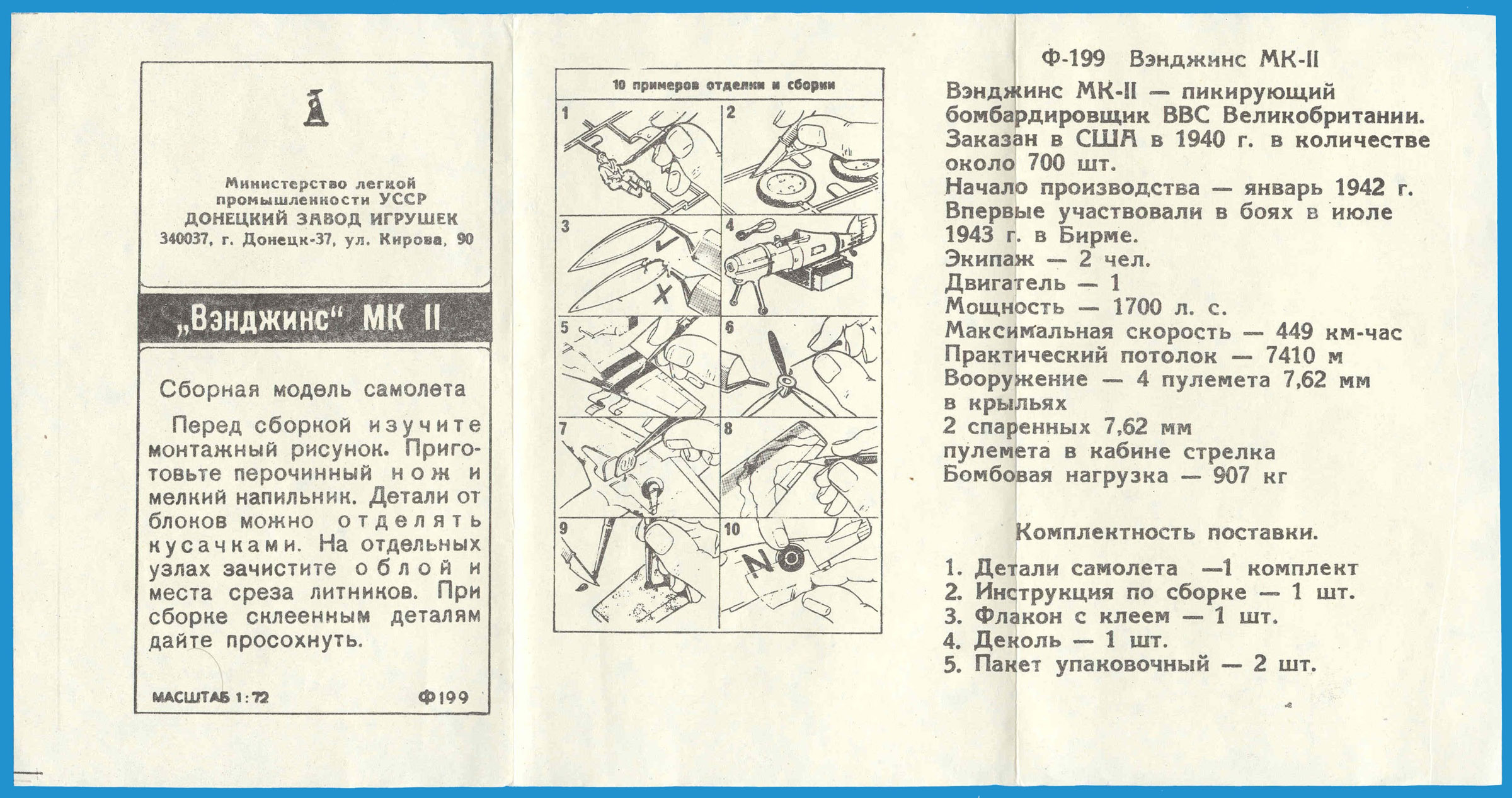На внутренний рынок “экс-фроговское” изделие вышло под коробочным названием “Сборная модель самолёта Ф199”, хотя в инструкции оно было указано как “Ф199 Вэнджинс Mk II”, что было заметно ближе к теме. Отливки упаковывались в пластиковые пакеты и коробки с бокс-артами “а-ля Ново”, но ближе к стилю поп-арт.